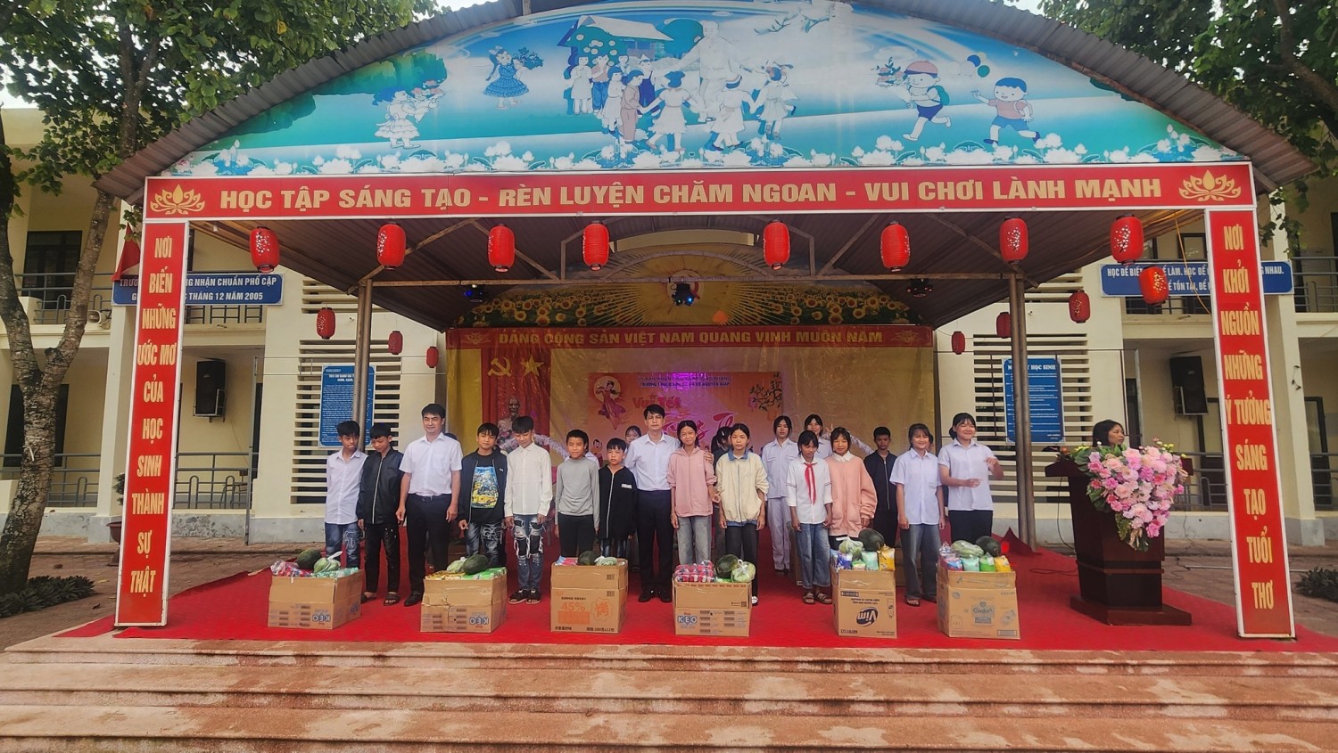 Mở đầu buổi lễ là các tiết mục văn nghệ đặc sắc do học sinh các khối lớp biểu diễn. Những bài hát, điệu múa rộn ràng mang đậm sắc màu Trung thu đã tạo nên không khí tươi vui, phấn khởi, khiến sân trường trở nên rực rỡ và tràn đầy tiếng cười. Sau phần văn nghệ, các em học sinh được tham gia nhiều trò chơi hiện đại, vui nhộn do cô Tổng phụ trách Đội điều hành. Các trò chơi mang lại tiếng cười sảng khoái không chỉ cho học sinh mà cả các thầy cô giáo, tạo nên bầu không khí gắn kết, thân thiện và tràn đầy năng lượng – đúng tinh thần của Tết Trung thu đoàn viên. Đặc biệt, trong chương trình, thầy Hiệu trưởng đã thay mặt nhà trường trao quà Trung thu cho từng lớp, gửi đến các em những lời chúc tốt đẹp, mong các em luôn chăm ngoan, học giỏi, biết yêu thương, chia sẻ và phát huy truyền thống hiếu học của trường.